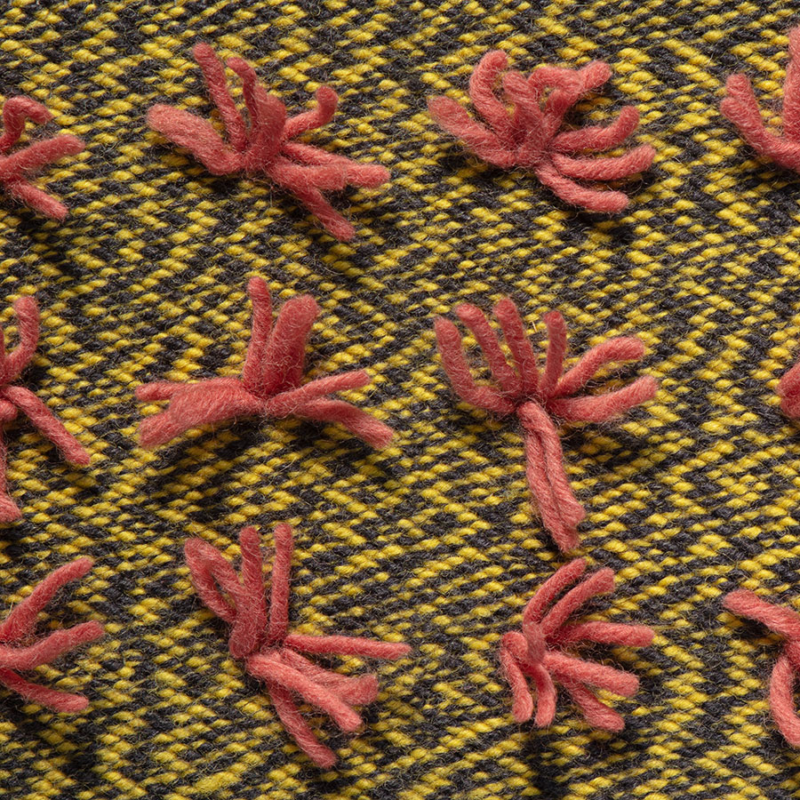 Floss reimagines traditional hand-knotting rug techniques in a similarly exuberant palette, with evenly spaced freeform tufts dotted across its surface.